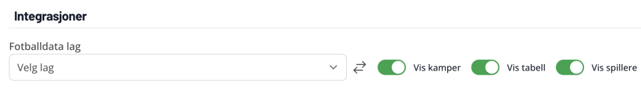 Når Fotballdata er aktivert på Klubbnettsiden deres, vil dere på lag/utøver-side i redigeringsmodus få opp et felt for “Integrasjoner” som på bildet under. Her kan du bla i gjennom og finne ønsket lag å presentere på lag/utøver-siden, huk så av knapper etter behov.