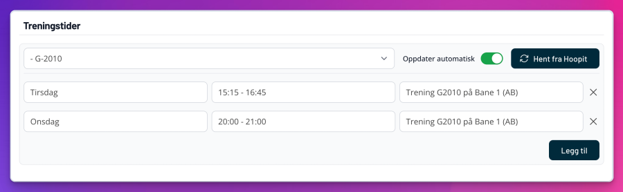 - På Lag: Personer‑seksjonen ligger der automatisk. Du får også Treningstider som kan hentes fra Hoopit.