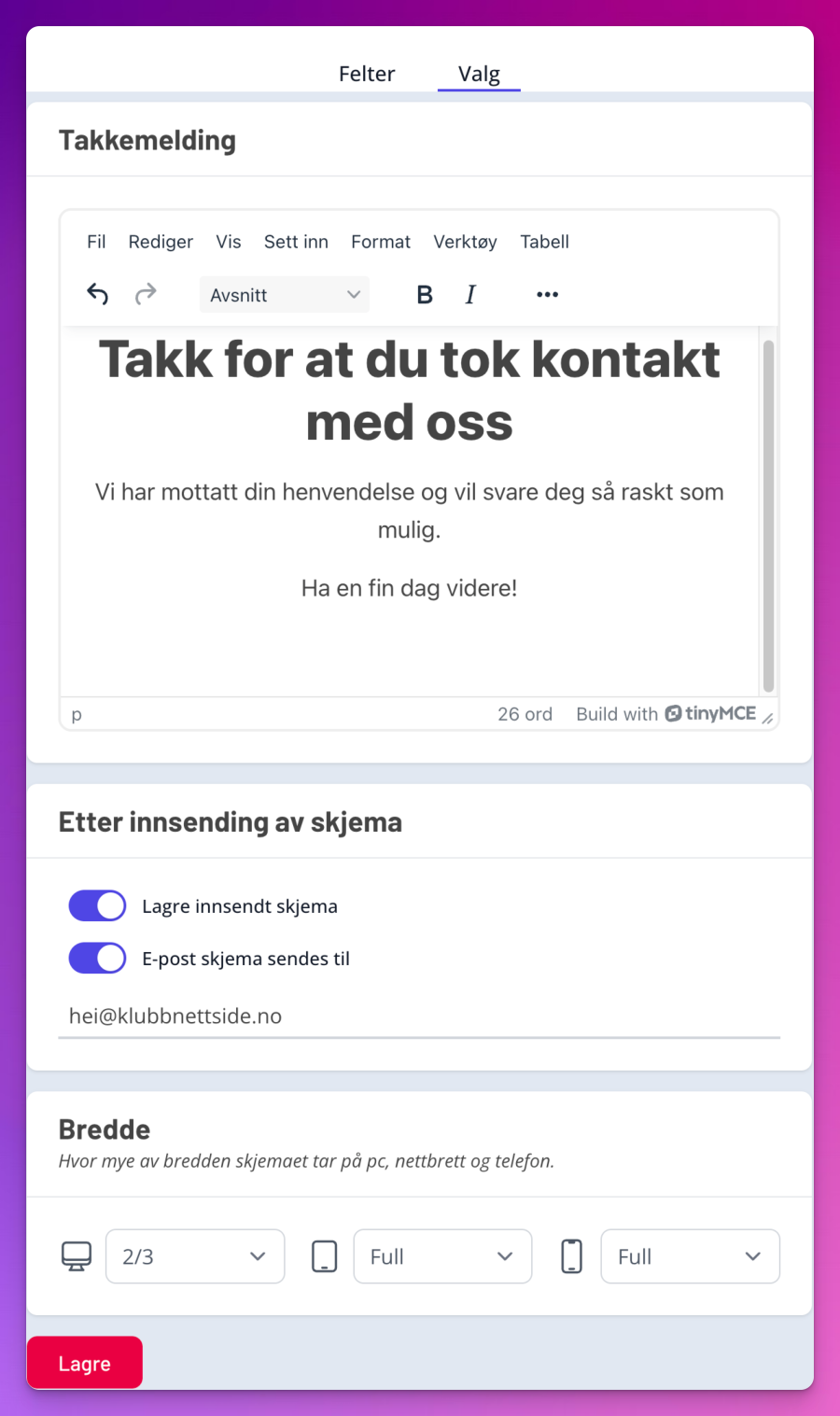 - Takkemelding - Her skriver du teksten som innsenderen vil få opp etter at skjema er sendt inn. Her kan det være lurt å stile teksten med overskrift og en tekst så det ser fint ut.