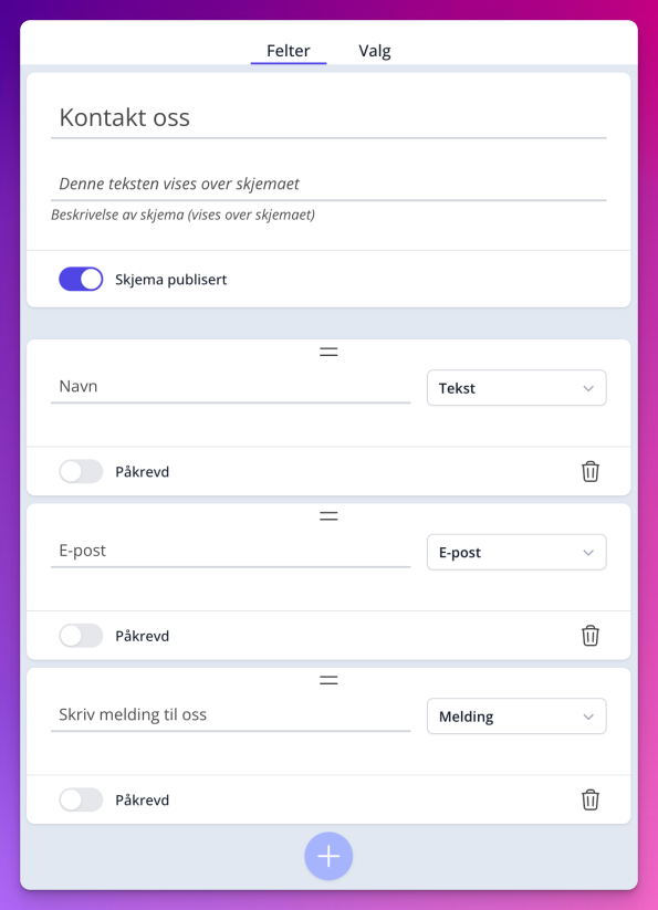 - Alle felter har valget “Påkrevd”, aktiverer du denne så må innsenderen fylle ut feltet for å kunne sende inn.