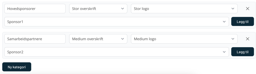 - Legg opp sponsorer ved å først trykke “Ny kategori”. Har man ulike kategorier av sponsorer kan man legge opp flere kategorier nedover samt velge størrelse på overskrift og logovisning deretter.